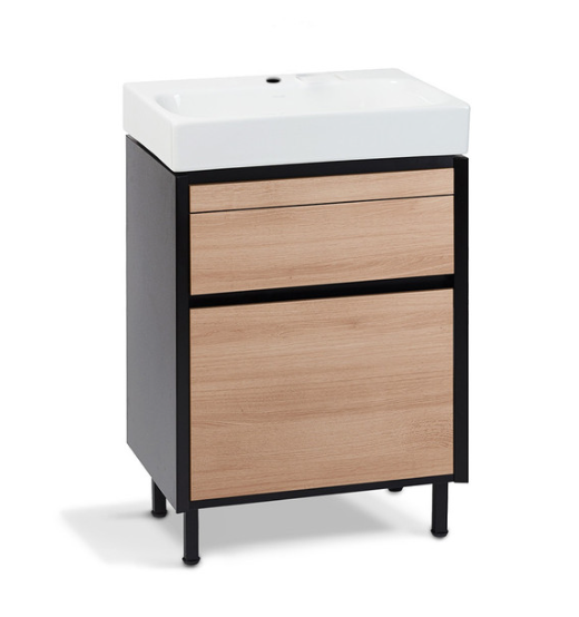 此款儲物櫃採用耐用的防水材質,集功能性與設計於一身;創新的後置排水管讓工作與盥洗空間加大,抽屜、層架與模組化收納設計等擴大收納空間並保持整潔。